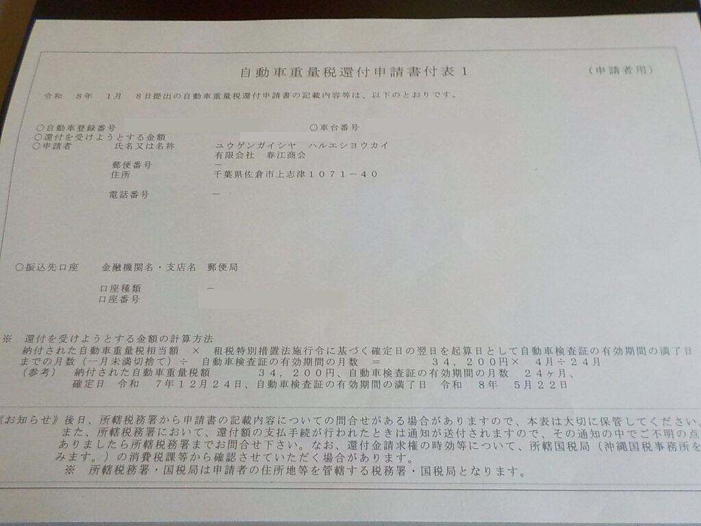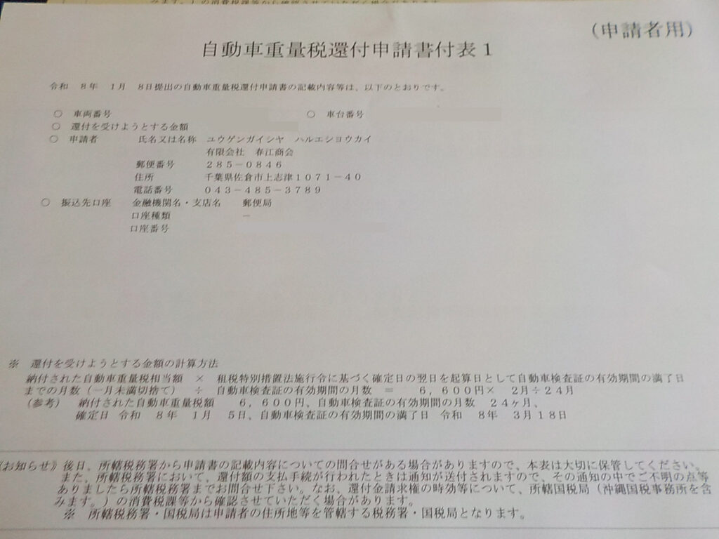 実際の自動車重量税 還付通知書の一例